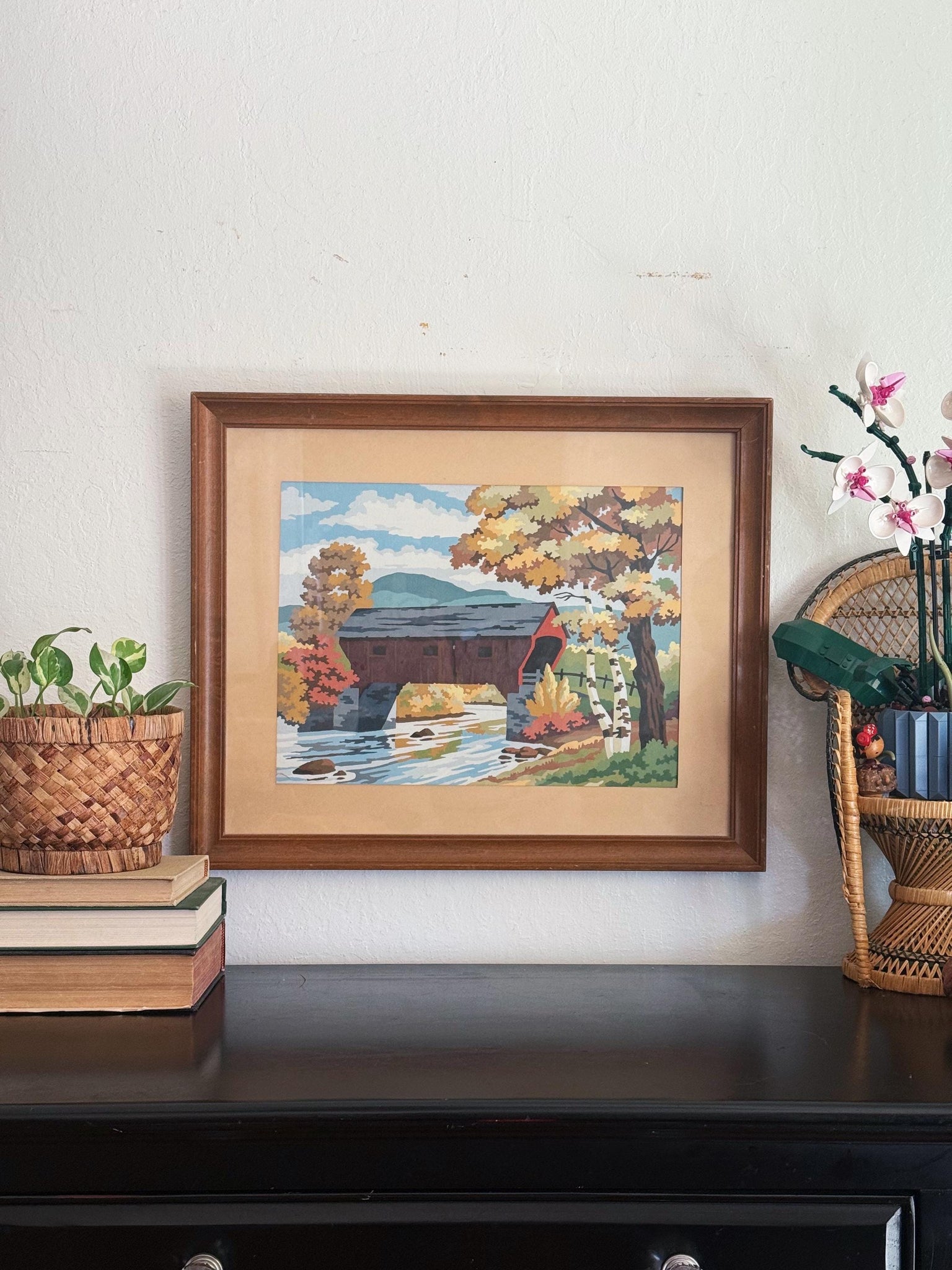 Beautiful paint-by-numbers landscape painting featuring a barn red bridge over a river against a forest backdrop.