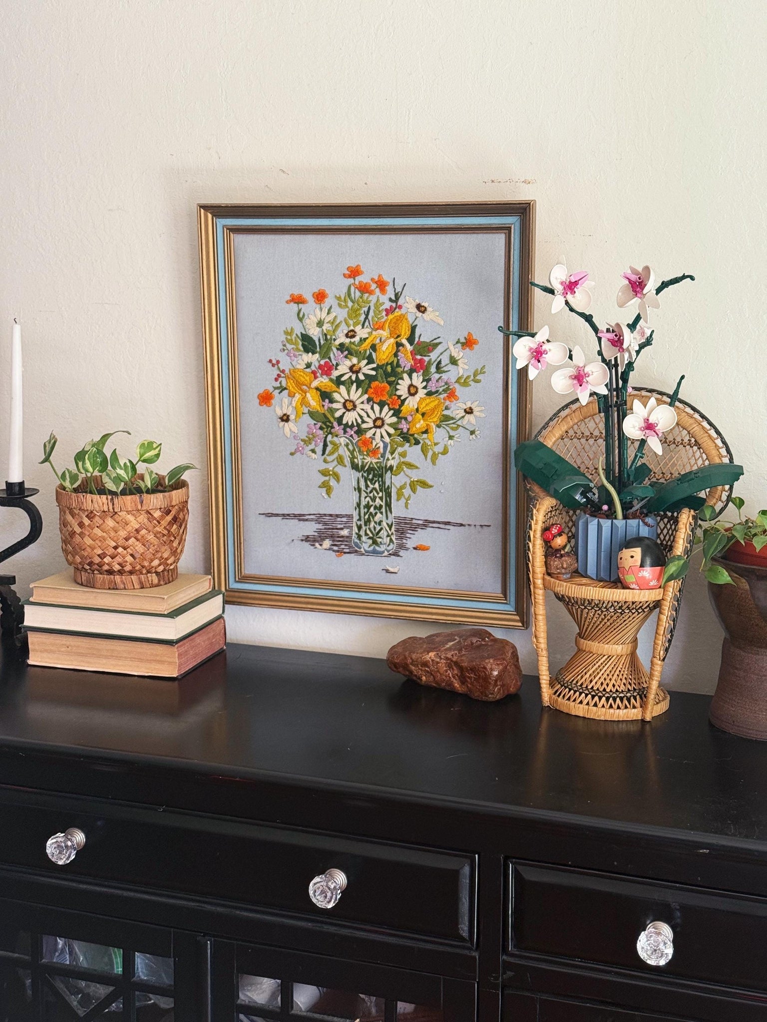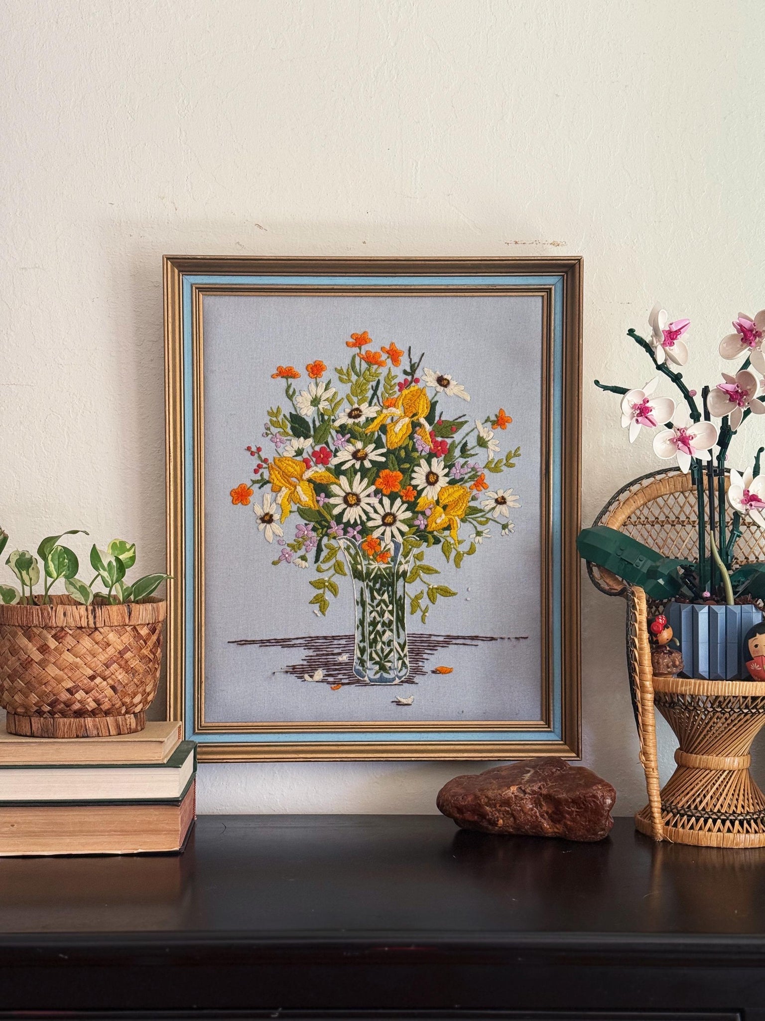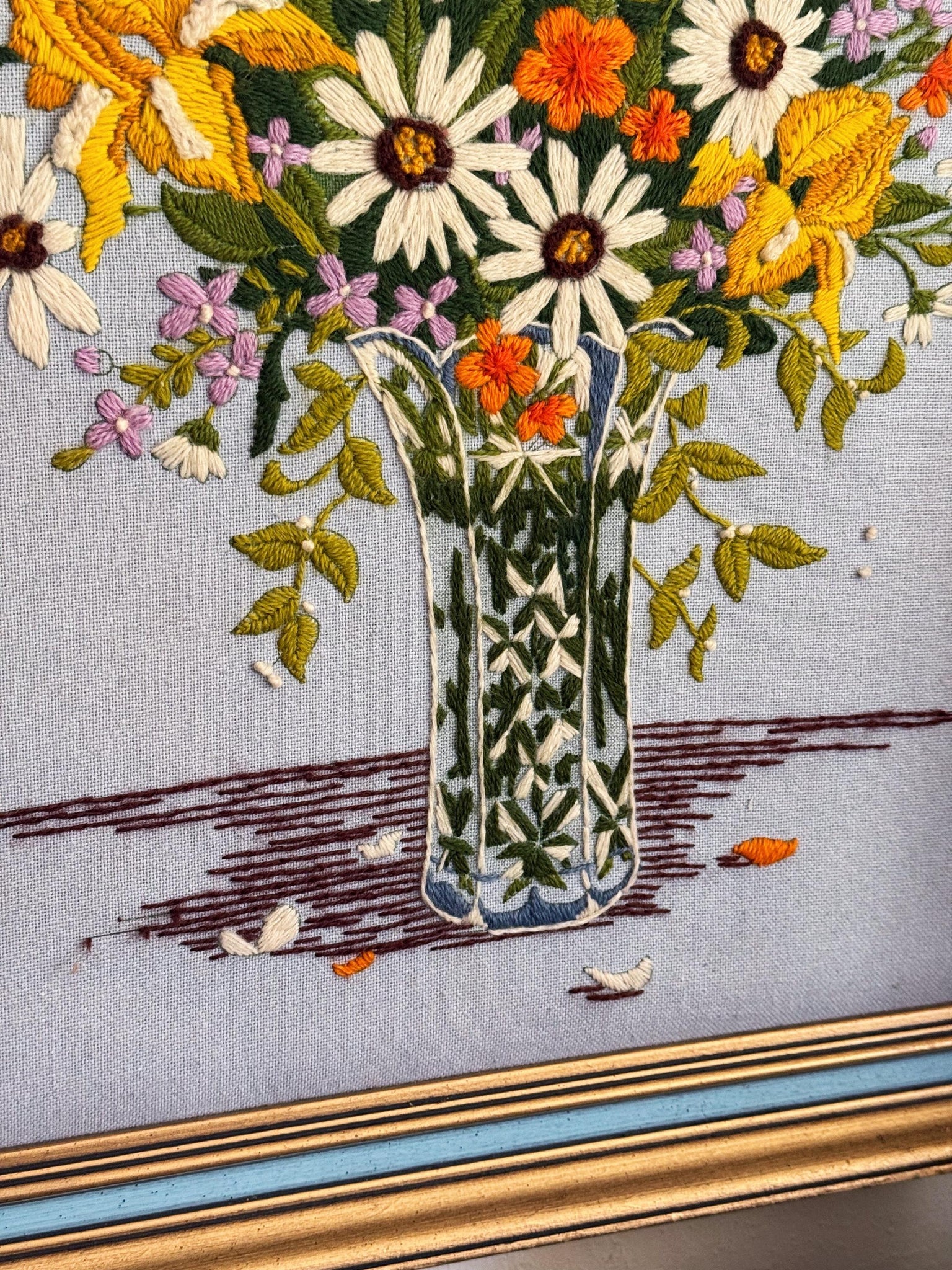 Vintage floral bouquet in vase crewel wall art