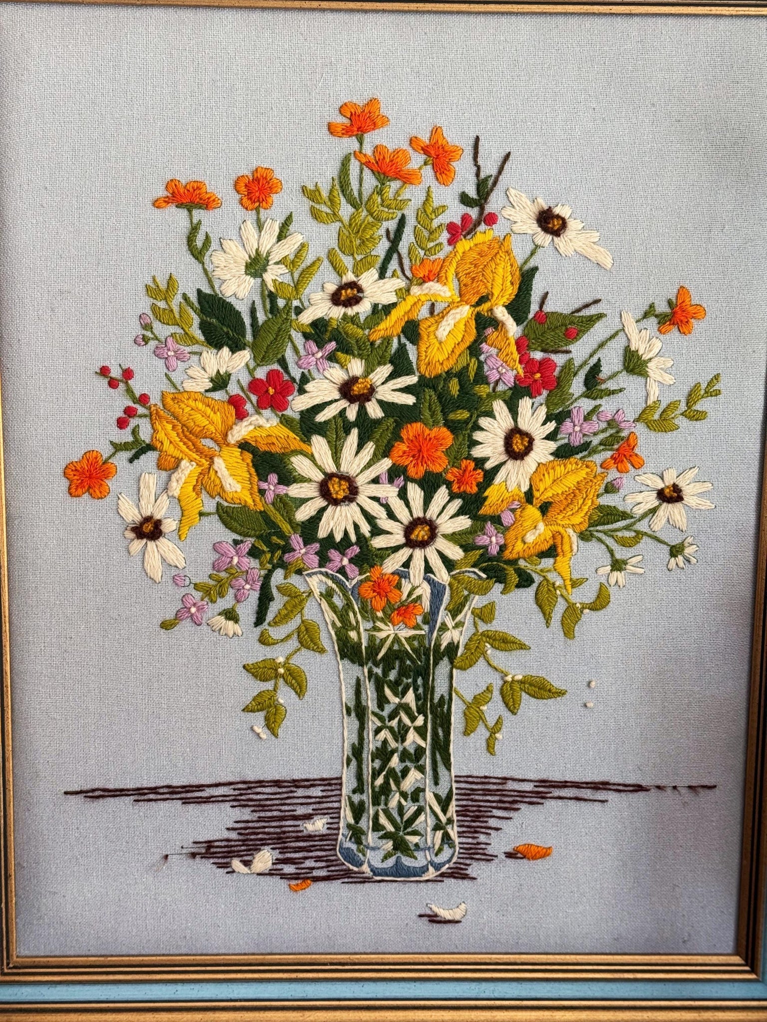 Beautifully hand-made crewel art depicting a mixed floral bouquet in a clear glass ornate vase.