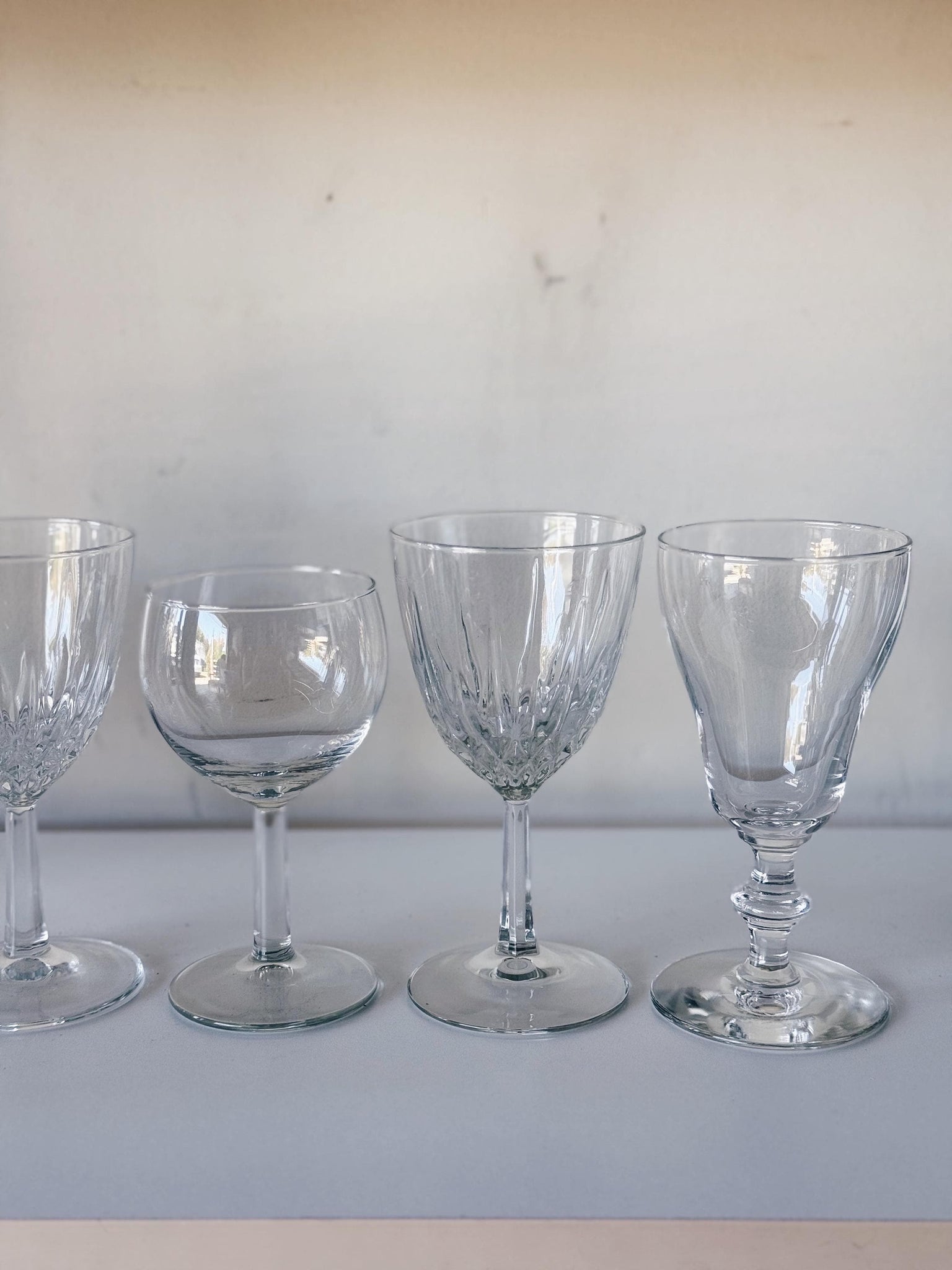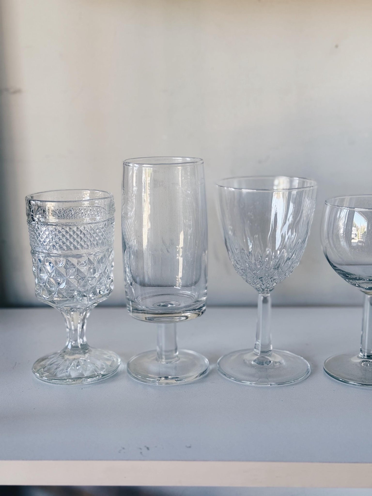 Set of six (6) miniature glass goblets in clear glass, each with varying size and style.