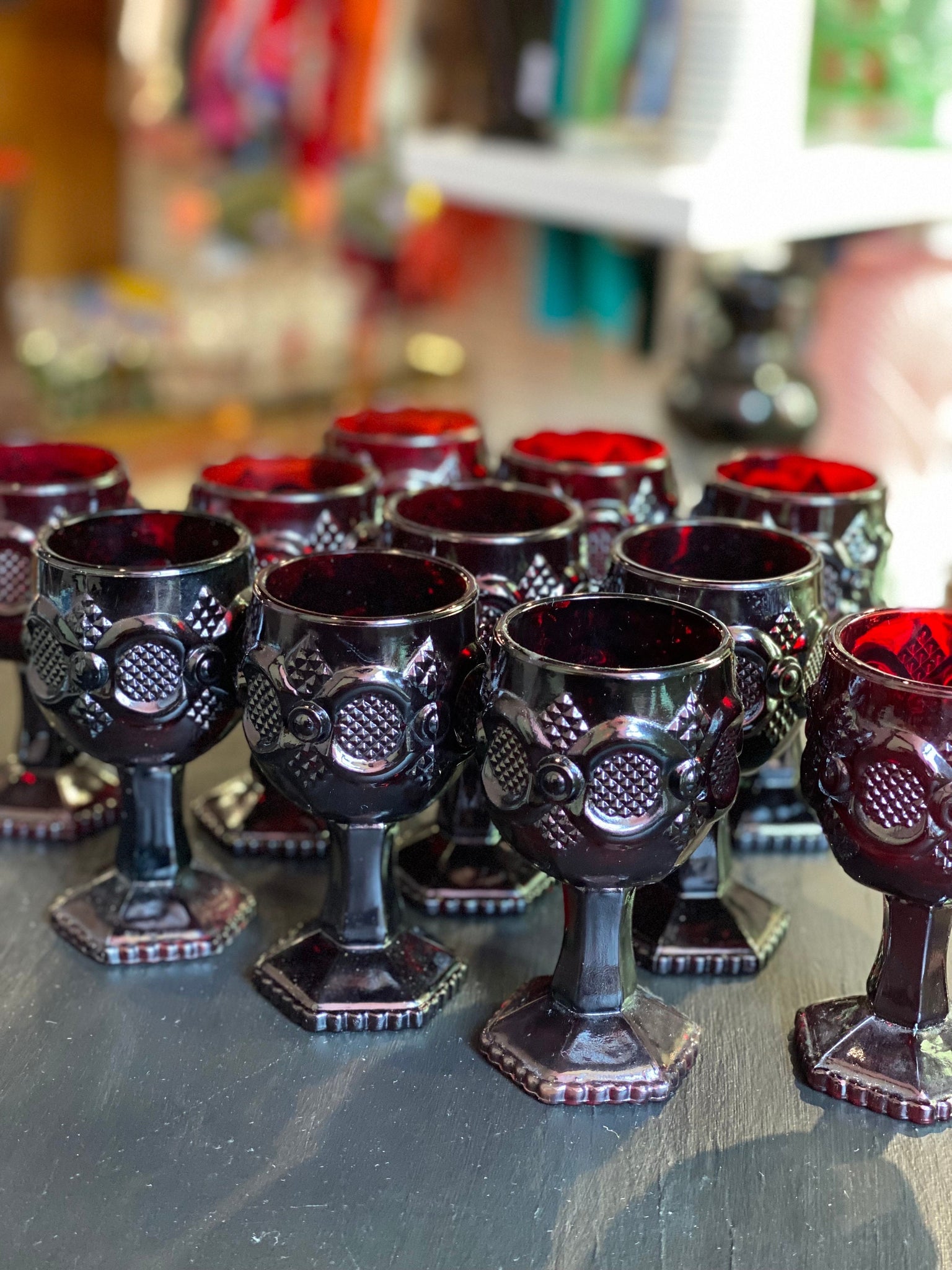 Classic Avon set of miniature goblets in a beautiful deep red hue. From the Avon 1876 Cape Cod Commemorative Collection and features a beautiful ornate Roman rosette pattern.