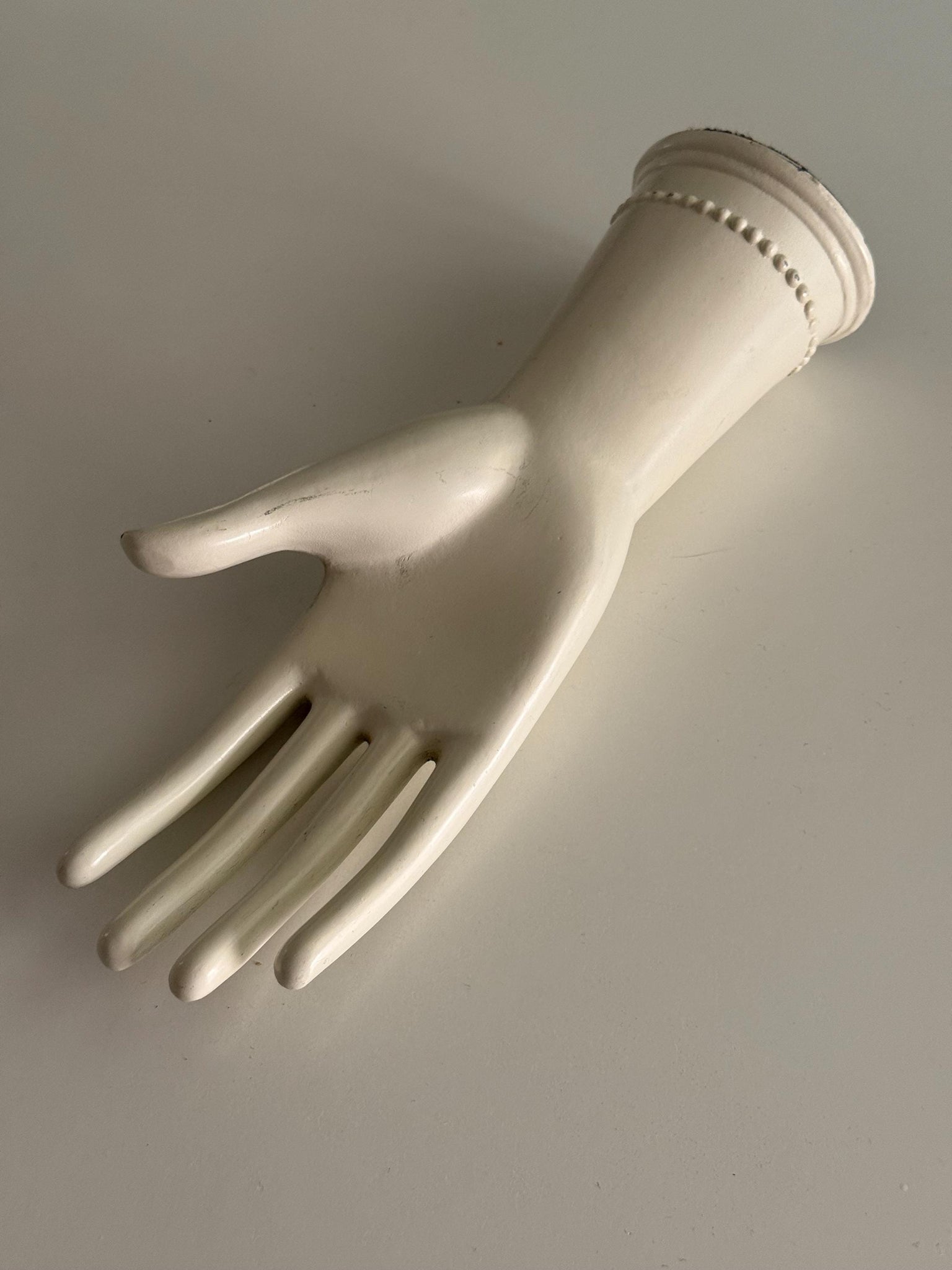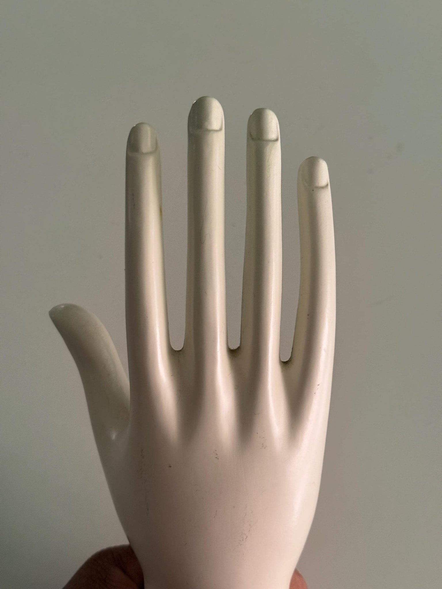 Standing white porcelain ceramic hand sculpture.