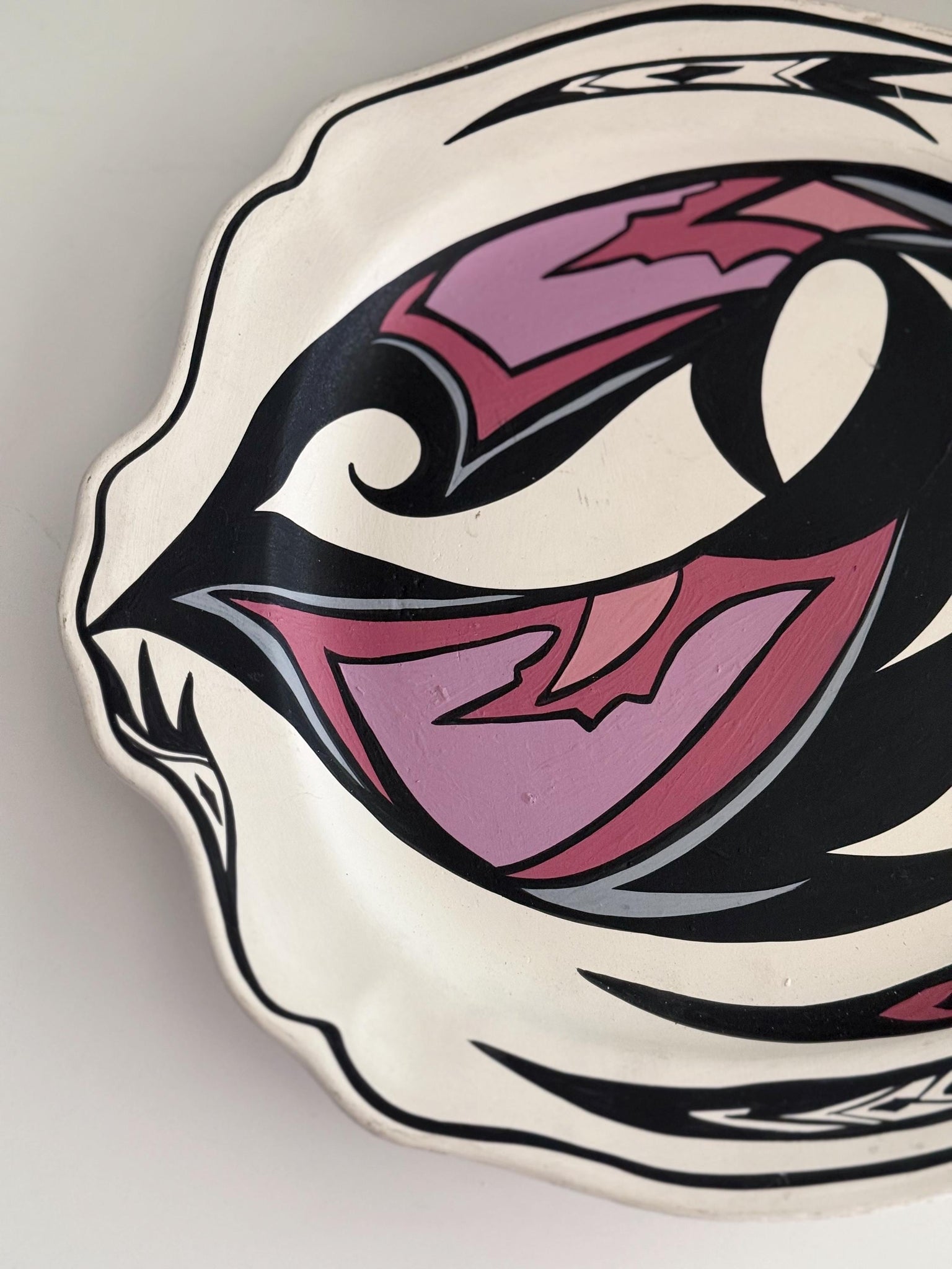 White, black, and purple colors are beautiful and striking on this tribal style platter.